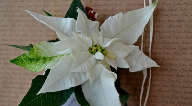 Minijoulutähden ruukun ympärille muovipussi. Kääreeksi joulupaperia. Kannattaa asetelmia tehdessä miettiä miten kasvia kastellaan ja hoidetaan. Tässä joulutähden voi ottaa pois paperikääreestä kastelun ajaksi.